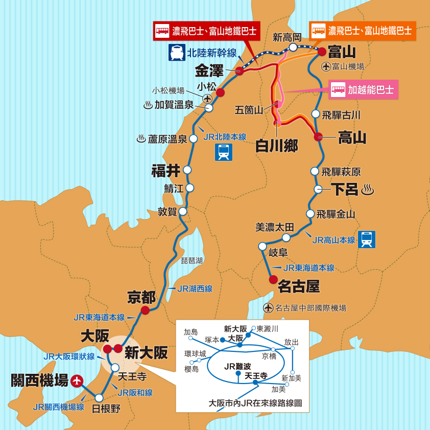 高山・北陸地區鐵路周遊券,名古屋~下呂~高山~富山之間、 關西機場~大阪市內~京都~加賀溫泉~金澤之間的JR在來線、 金澤~富山間的「北陸新幹線」皆可不限次數自由搭乘!前往世界遺產白川鄉與五箇山的便捷巴士也可不限次數自由搭乘!