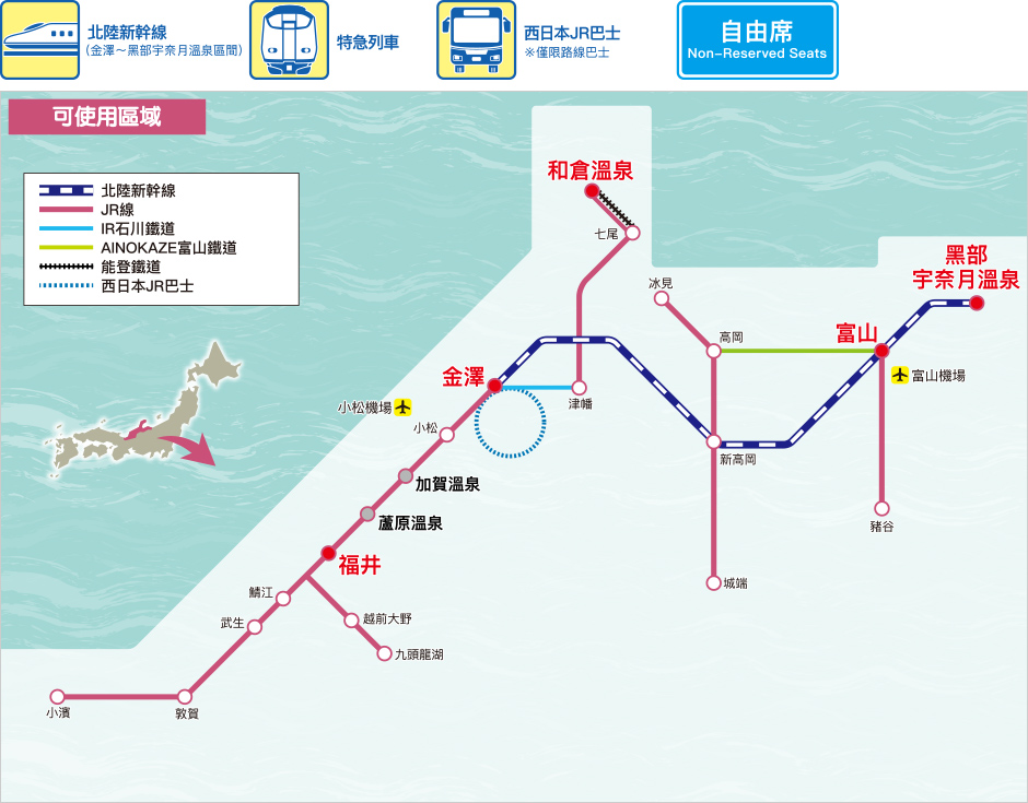 ・ 北陸地區鐵路周遊券在有效區域乘車不受限制。