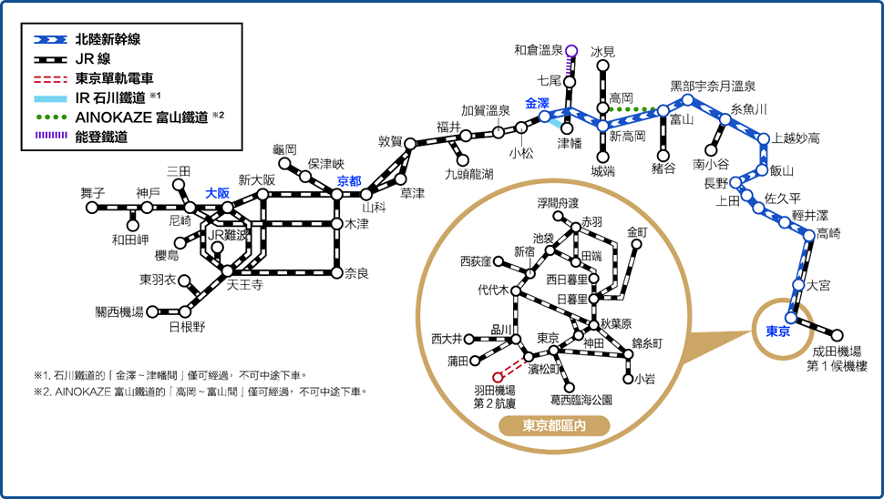 - 大阪~金澤間的特急「THUNDERBIRD」、金澤~東京間的北陸新幹綫
