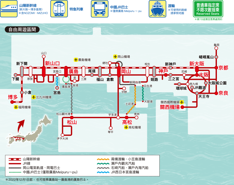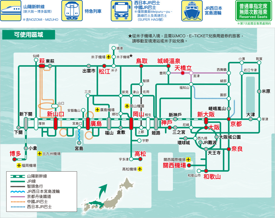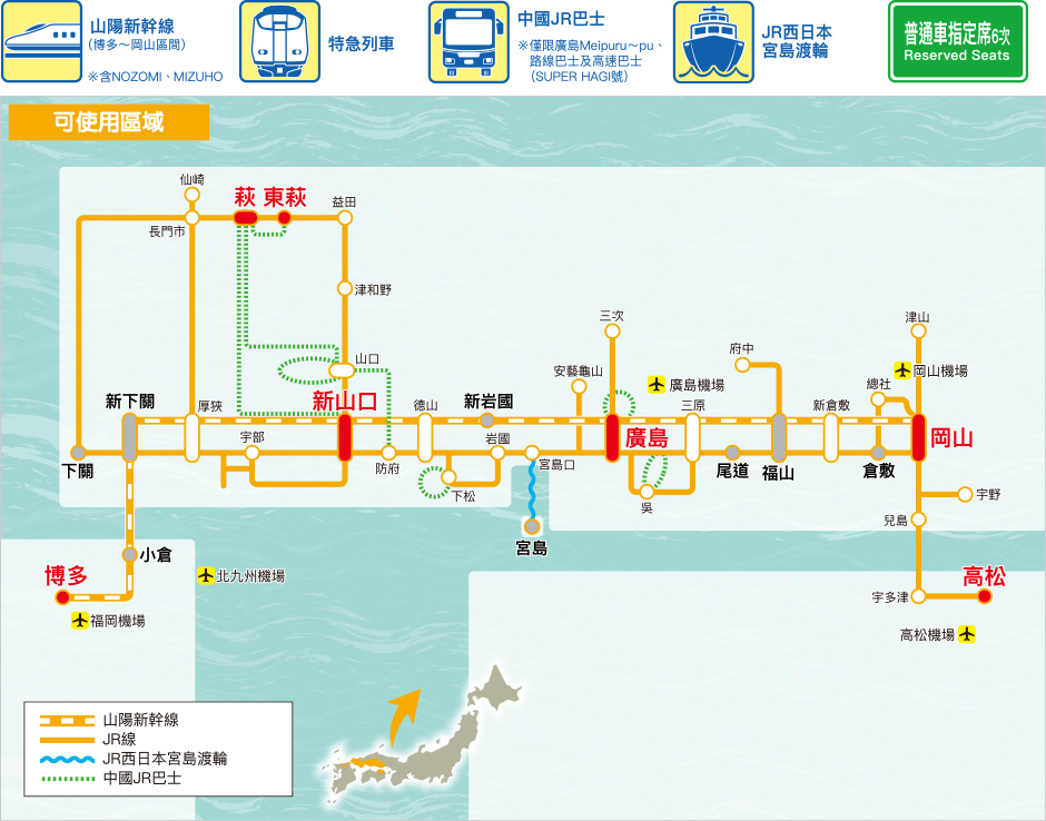 廣島&山口地區鐵路周遊券,從福岡機場前往山口、廣島時,山陽新幹線 (含NOZOMI、MIZUHO之博多─三原間) 及區域內之特快‧快速‧普通列車自由席、JR西日本宮島渡輪都能無限制搭乘。*不包括九州島內的當地原有路線 (博多─下關間)