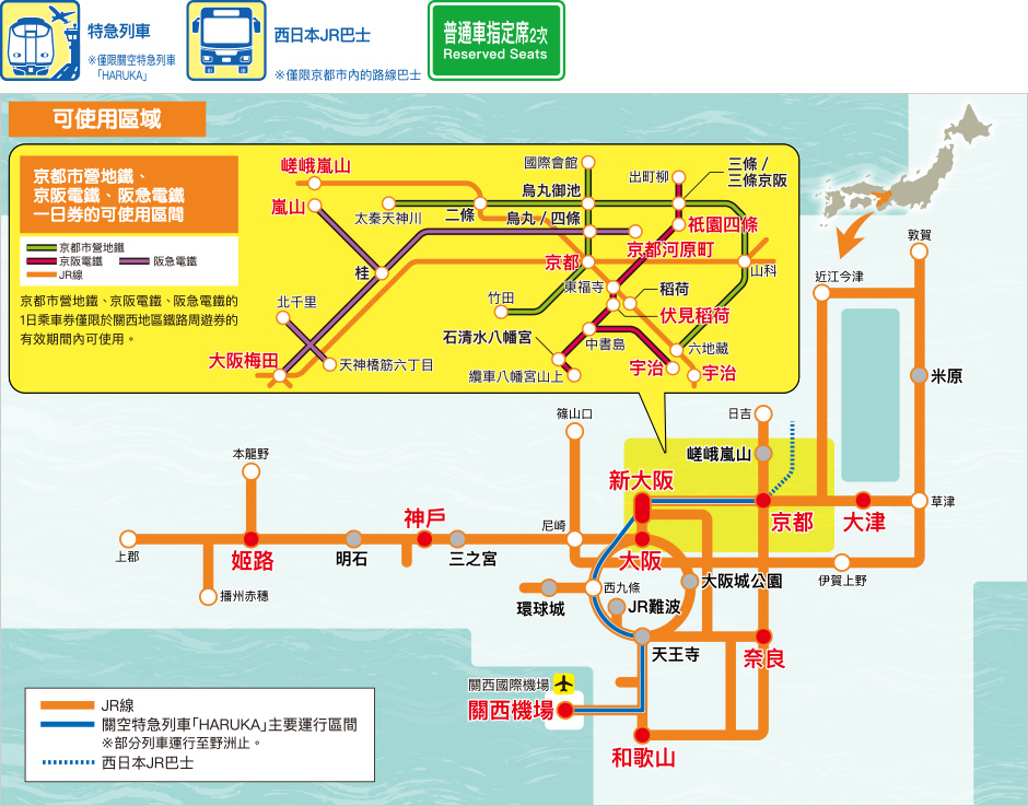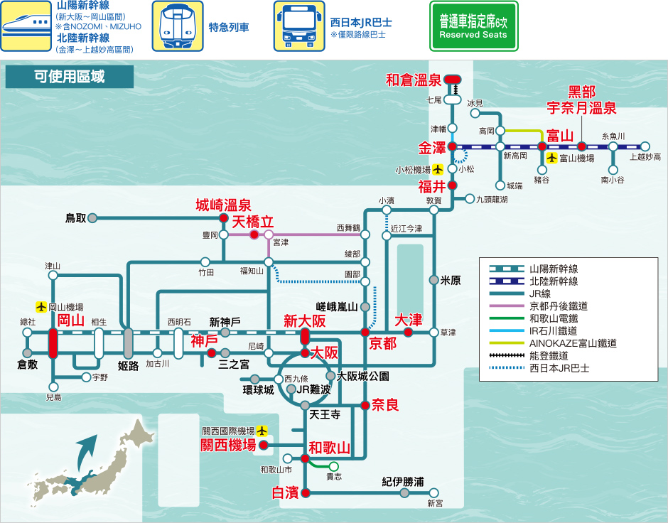 關西廣域地區鐵路周遊券,從關西機場前往關西地區及岡山‧倉敷、白濱、城崎溫泉 、高松時,山陽新幹線 (含NOZOMI、MIZUHO之新大阪─岡山間) 及區域內之特快列車對號座‧快速‧普通列車的自由席都能無限制搭乘。*不包括東海道新幹線 (新大阪─京都)