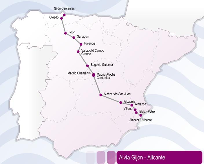 - Alvia列車經過精心設計, 舒適寬敞,有良好的照明條件。 可免費停車使用俱樂部車廂並閱讀報紙。免費提供餐飲並服務到座。
